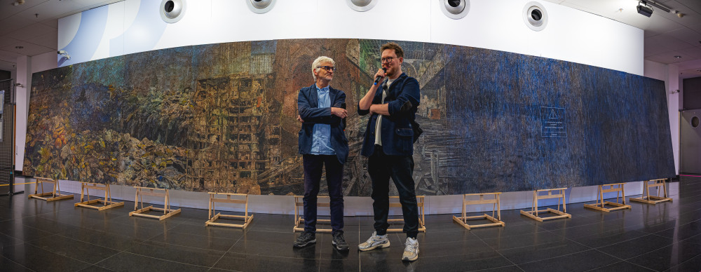"Od czterdziestu lat maluję "niekończący się" cykl pod wspólną nazwą "The show must go on". Podstawowym elementem całości jest czas. Cykl "Świat który stworzyliśmy" został zapoczątkowany w czasie pandemii. Zapowiedziany lockdown odczytałem jako szansę na nieprzerywaną pracę przez dłuższy okres czasu. Dziesięć obrazów w sto dni. Tematyka cyklu była dla mnie oczywista. Odnalazłem w internecie fotografie powiązane z procesem, który stał za pandemią i zamieniając się w samobieżną drukarkę przeniosłem je na przygotowane płótna. Porównanie z drukarką nie jest tu przypadkowe, ponieważ postanowiłem ten jeden raz pozbyć się zbędnych emocji związanych z procesem malowania. Obrazy zostały podzielone na dziesięć poziomych części. Każdego dnia malowałem jeden poziomy pas, posuwając się jak drukarka od lewej do prawej i z góry na dół. Jeden obraz - dziesięć dni. Dziesięć obrazów - sto dni. Dopiero w następnym etapie pojawiły się emocje. Zacząłem nakładać faktury i warstwy destruujące namalowaną wcześniej opowieść. Choć cały cykl wydaje się być trochę pesymistyczno-katastroficzny, tak naprawdę jest to obraz o sile natury. Mam przeświadczenie, że gdy już się wszyscy powybijamy z jakichś powodów, to nasza planeta bez nas odżyje".